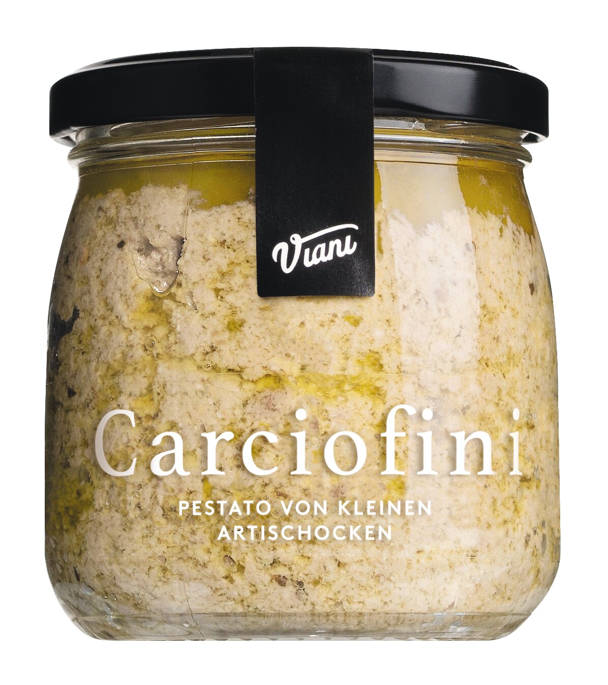 Artischocken 57 %, natives Olivenöl extra 33 %, Kürbiskerne, Zwiebel, Nüsse, Knoblauch, Sardellen in Öl (Sardellen, Sonnenblumenöl, Salz), Minze, Basilikum, Petersilie, Salz, weißer Pfeffer, Säuerungsmittel: Milchsäure