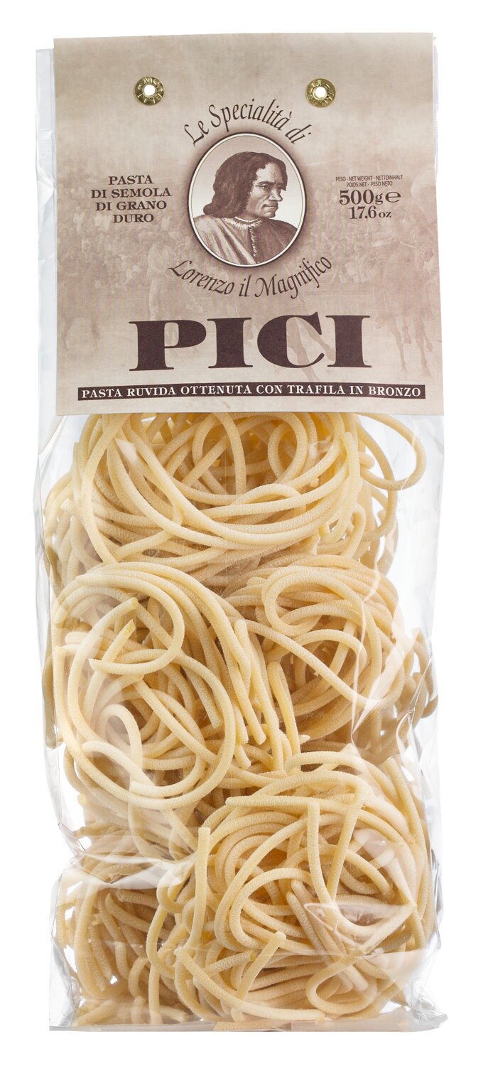 Pici sind traditionelle toskanische Nudeln, die sich durch ihre dicke, spaghettiähnliche Form und ihren kernigen Biss auszeichnen. Aus reinem Hartweizengrieß gefertigt, überzeugen sie durch eine besonders raue Oberfläche, die Saucen wunderbar aufnimmt.